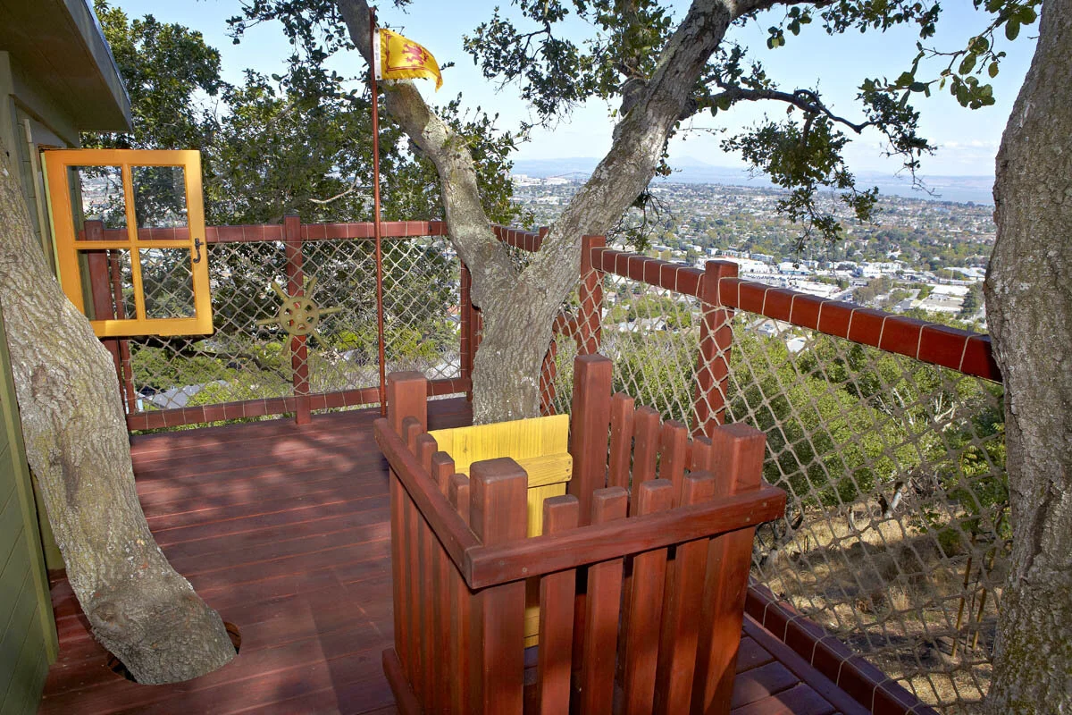 Contemporary Treehouse is not only up in a tree but also perched on a hill, leading to incredible views from the structure. This uniquely-shaped play space includes a clubhouse, a wrap-around deck, jiggly bridge, rock-climbing wall, fire pole, and rope ladder
