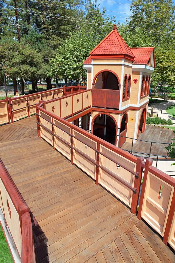 A couple of twists and turns are required to access the upper level by the elevated walkways, designed to allow access by all to the playhouse.