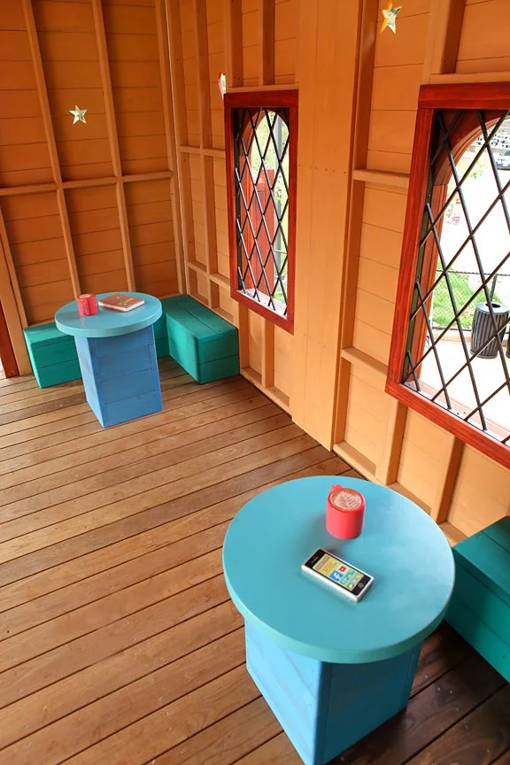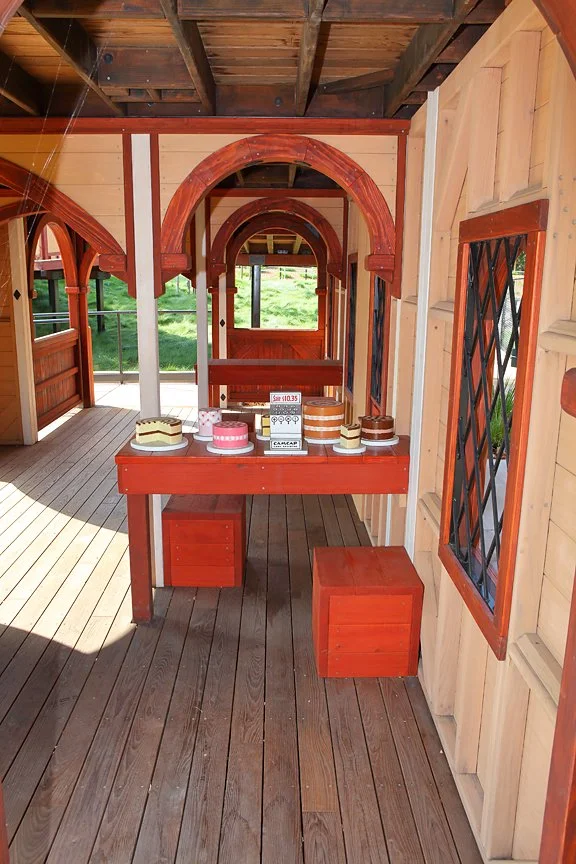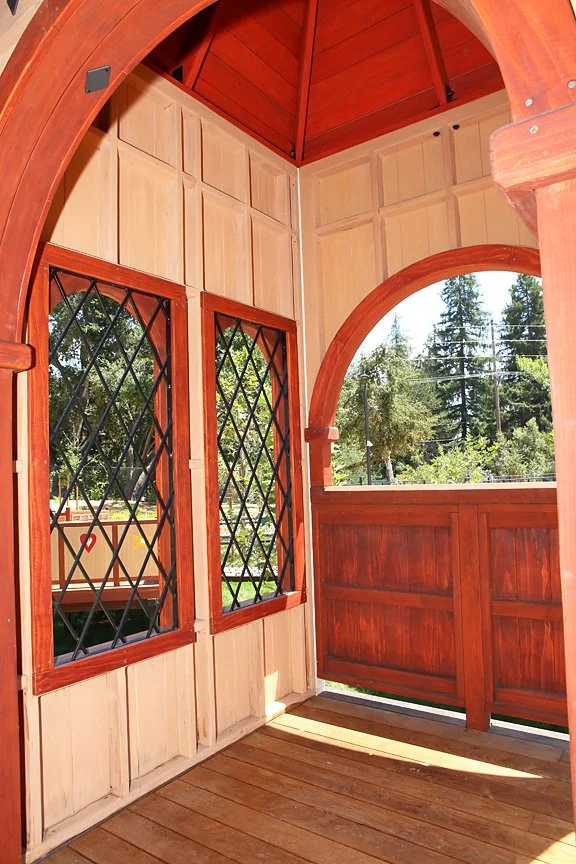 The retreat hut closest to the playhouse was stained in warm reds and browns to match the playhouse color palette.