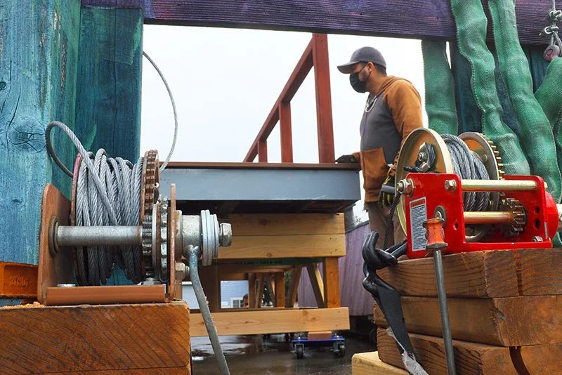 Careful coordination of each step was imperative. Here, Barbara guides the ramp drop. Up top, you can see the bridge mounted onto a custom-made delivery platform on wheels ready for her trip.