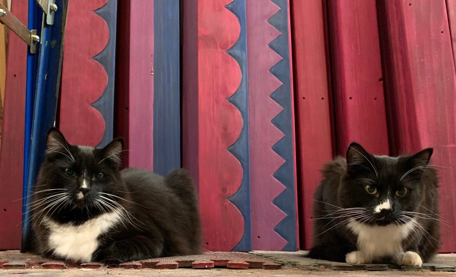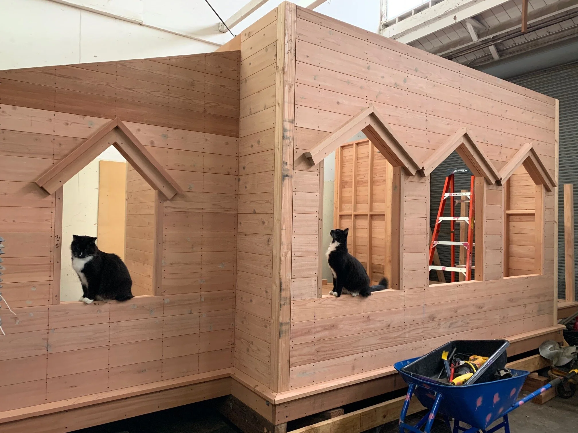 Quality control is another one of the taxing duties that these shop kitties take on. Here, the brothers, Sam and Dean, meticulously test each of the windows of a large playhouse being fabricated in the shop.