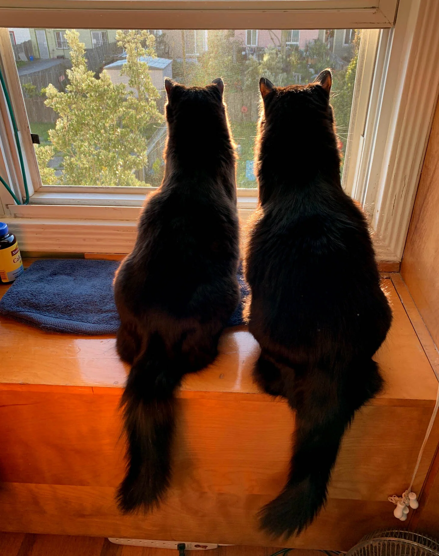 But a working cat’s responsibilities are never done! Here, these cats take on the crucial (and definitely NOT imaginary) job of standing guard over stained trim pieces as they dry. Stand back!