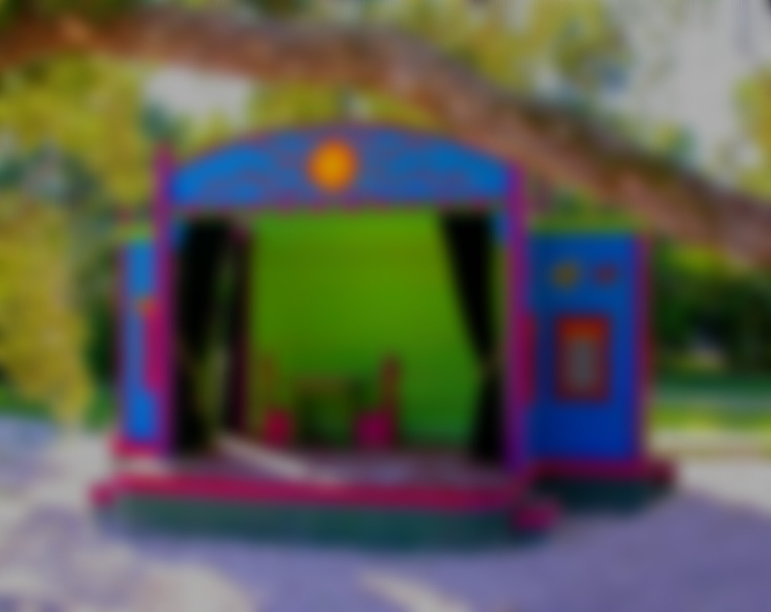 Sunshine Theater can stand alone or be part of a luxury play structure like its companion, Tropical Treehouse. Sunshine Theater's carved sun logo shines above the stage. The back wall in Apple Green reflects the sun-drenched leaves overhead. On the left of the stage, the outer wall of the Wings features a Ticket Booth window.